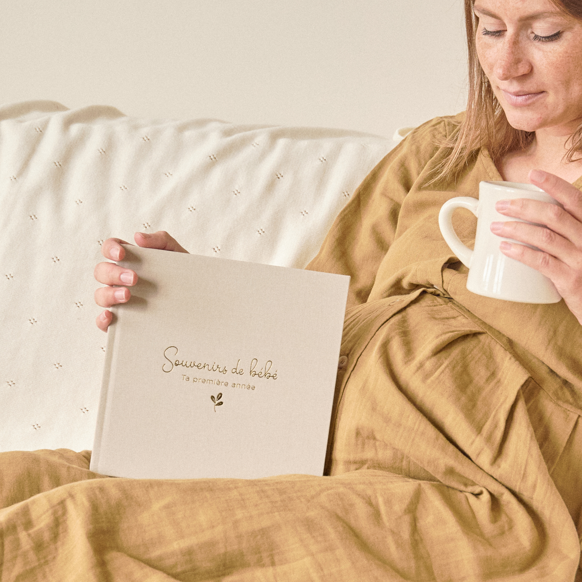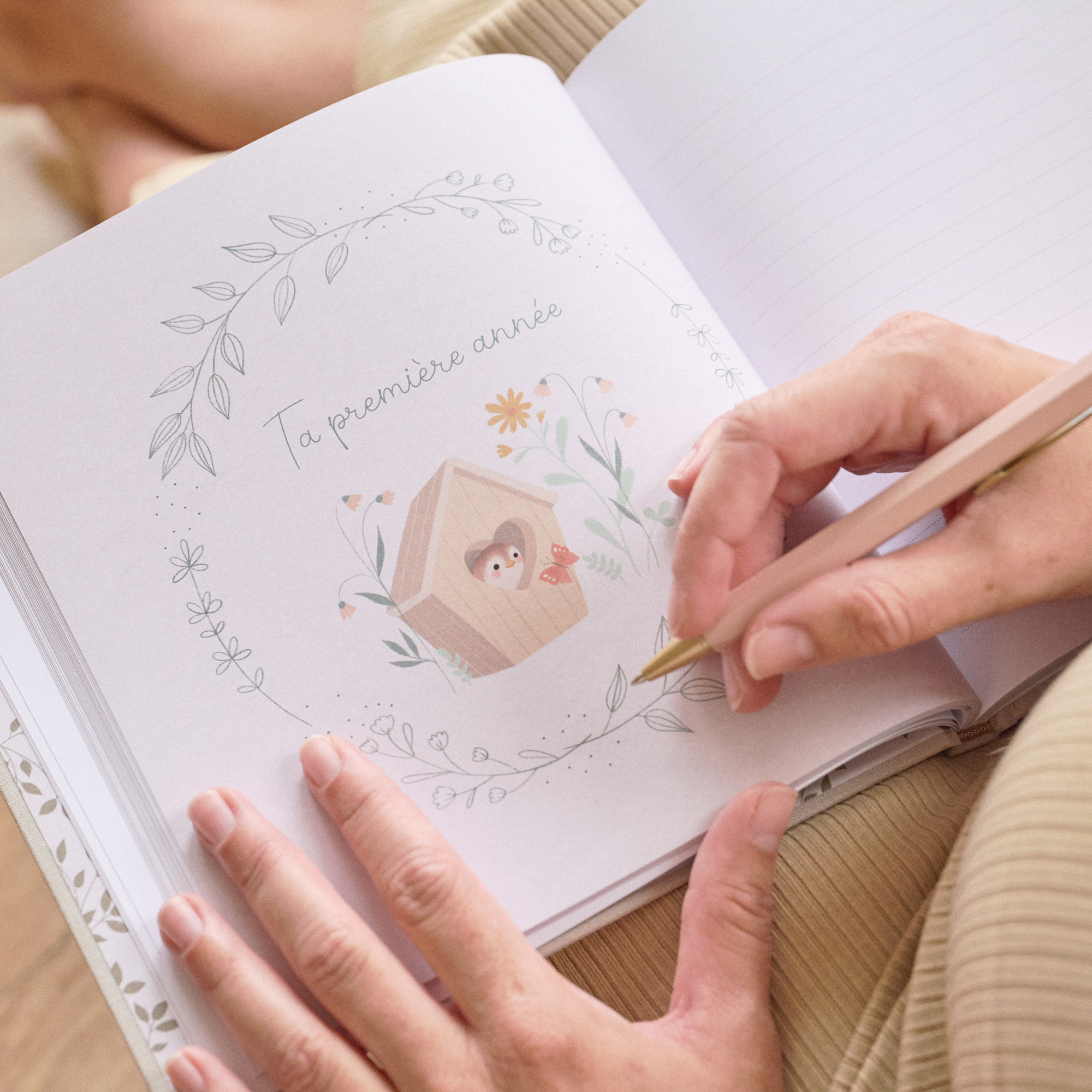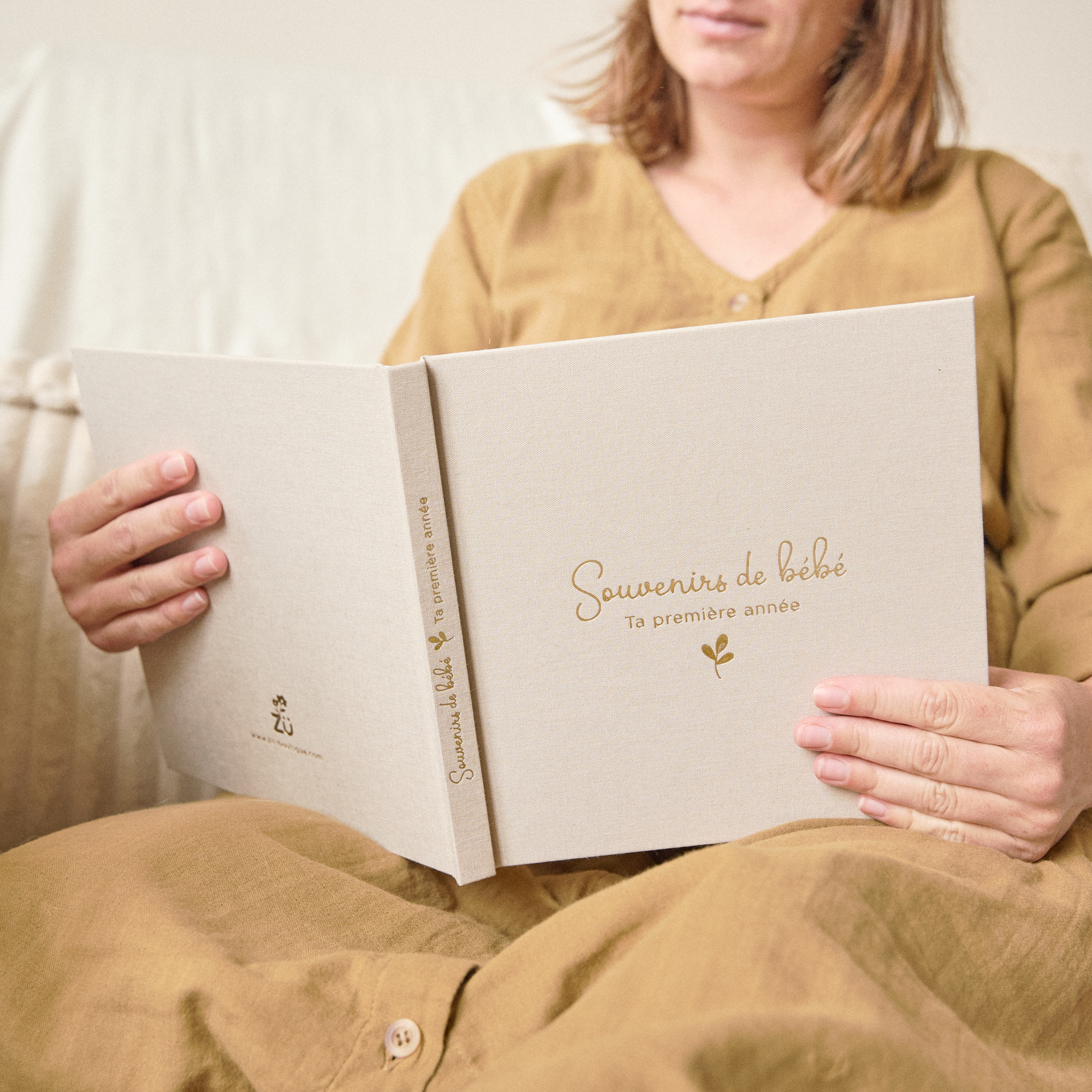 La couverture en toile épaisse de couleur grège et sa dorure à chaud apportent une touche d'élégance à ce livre, idéal à offrir en cadeau de naissance.